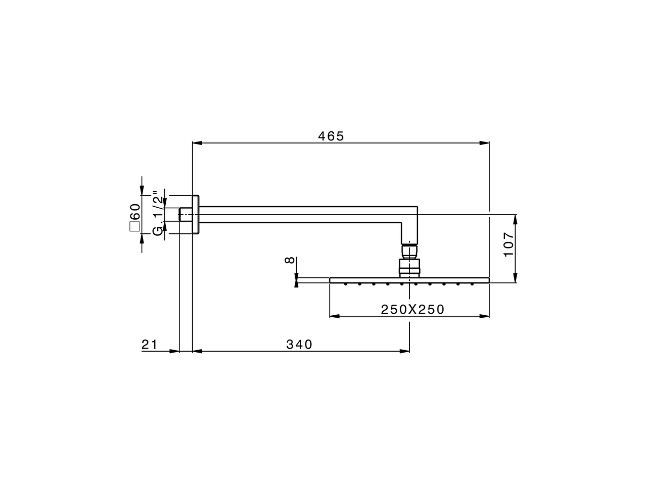 Braccio doccia con soffione,soffione quadro 250x250 mm in OTTONE,braccio doccia L.340 mm