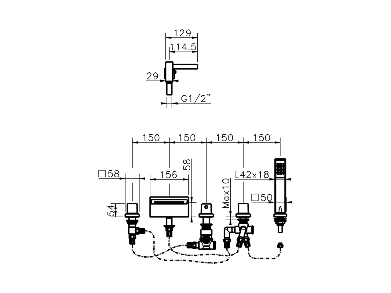 Miscelatore termostatico bordo vasca 5 fori,deviatore 2 uscite,doccetta monogetto Quad,flessibile estraibile 150 cm